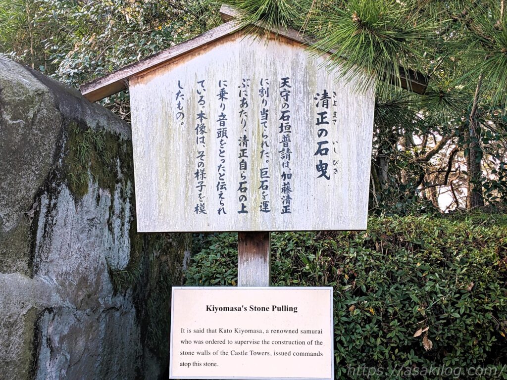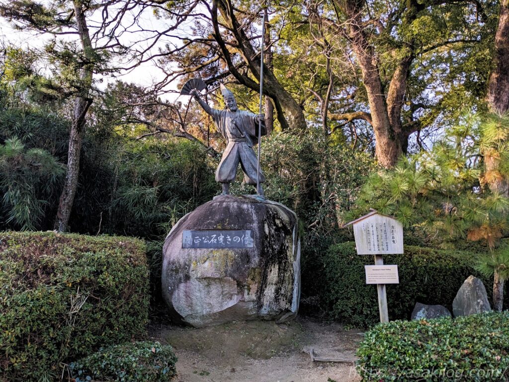本丸エリア入口付近の「清正公・石曳きの像」、天守の石垣工事をした加藤清正の像です。