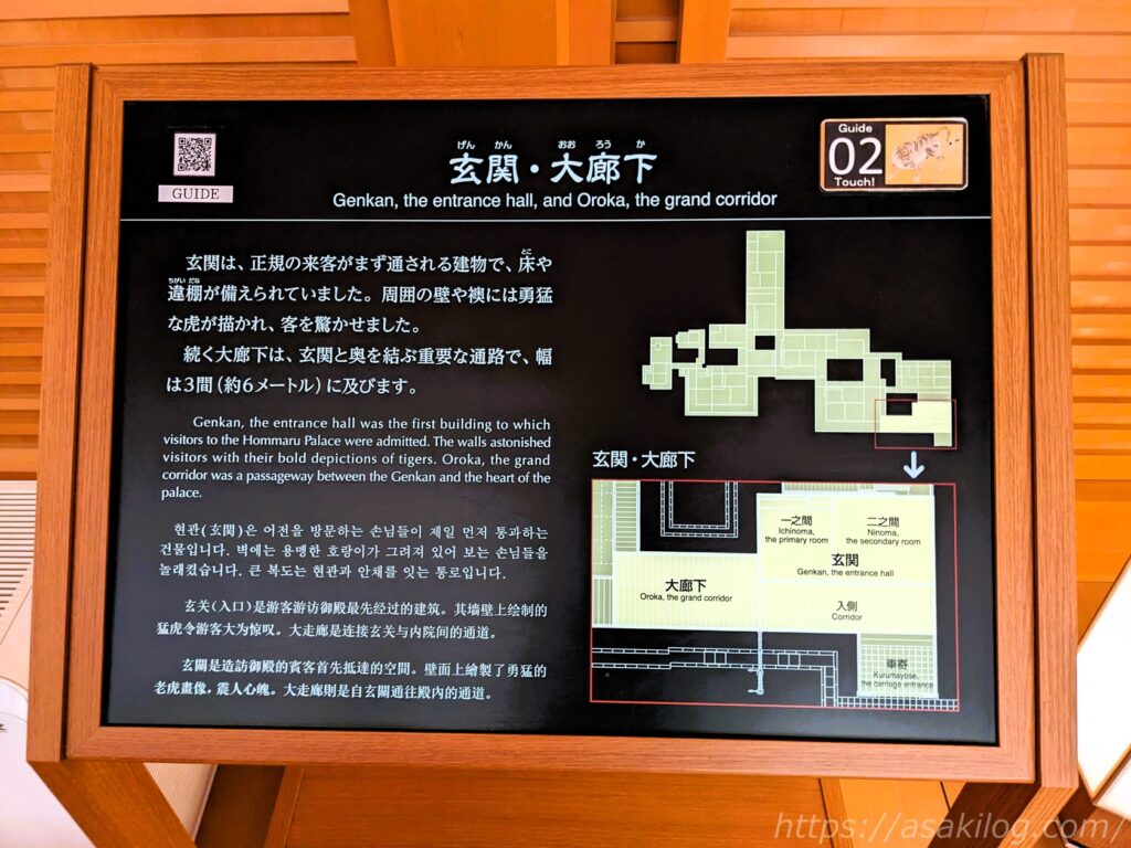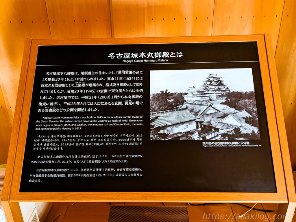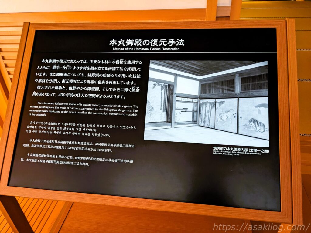 こちらが名古屋城の本丸御殿・本丸御殿の復元手法についての説明書きです。復元された建物、色鮮やかな障壁画、そして金色に輝く飾金具が相まって、400年前の壮大な空間が蘇っているそう。