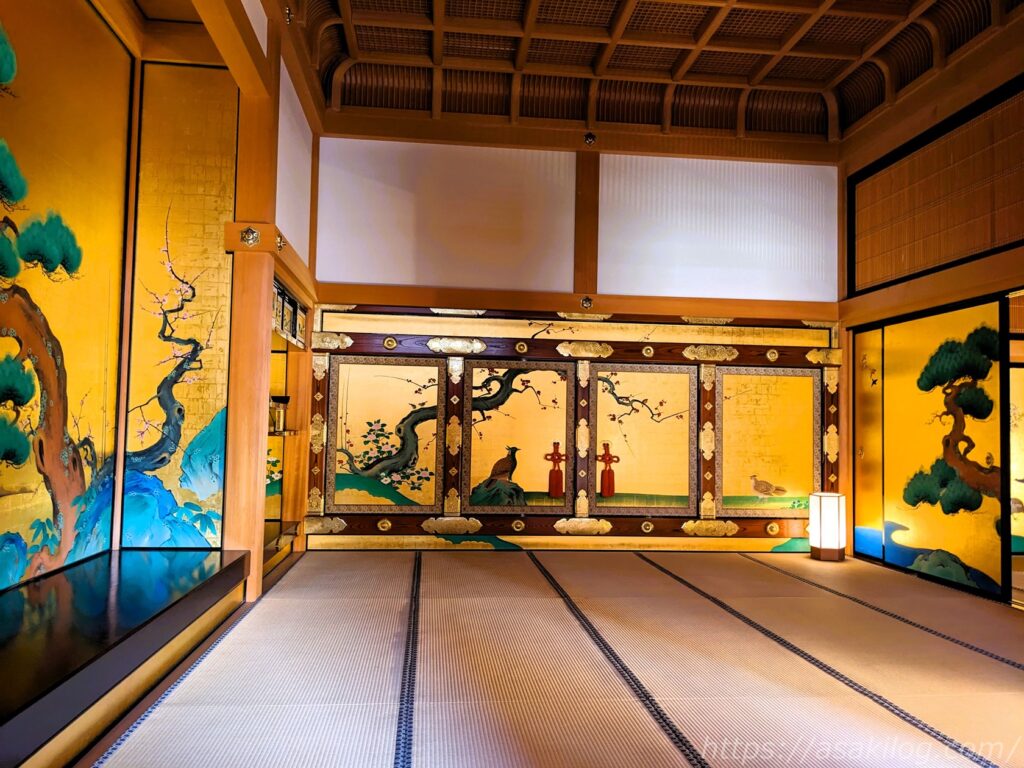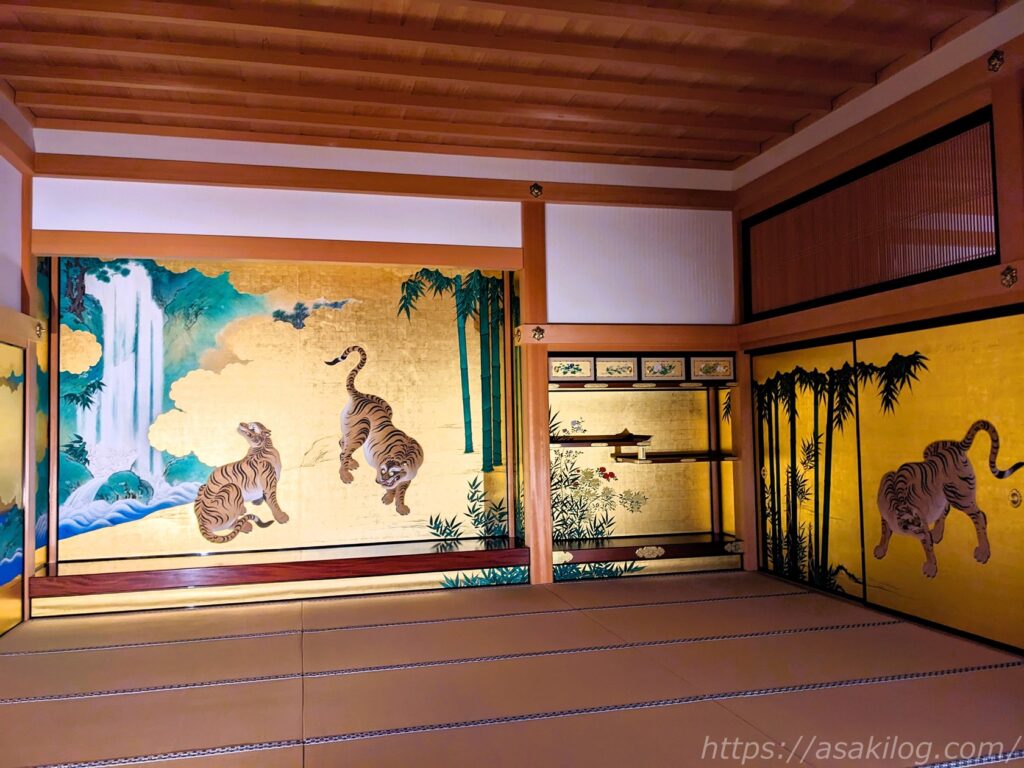 本丸御殿では、日本画史上最大の画派・狩野派の絵師たちの城壁画により、各部屋を美しくキラキラと飾っているのが特徴です。精密に復元模写され、植物・動物・風景など、部屋ごとに異なるテーマが描かれています。