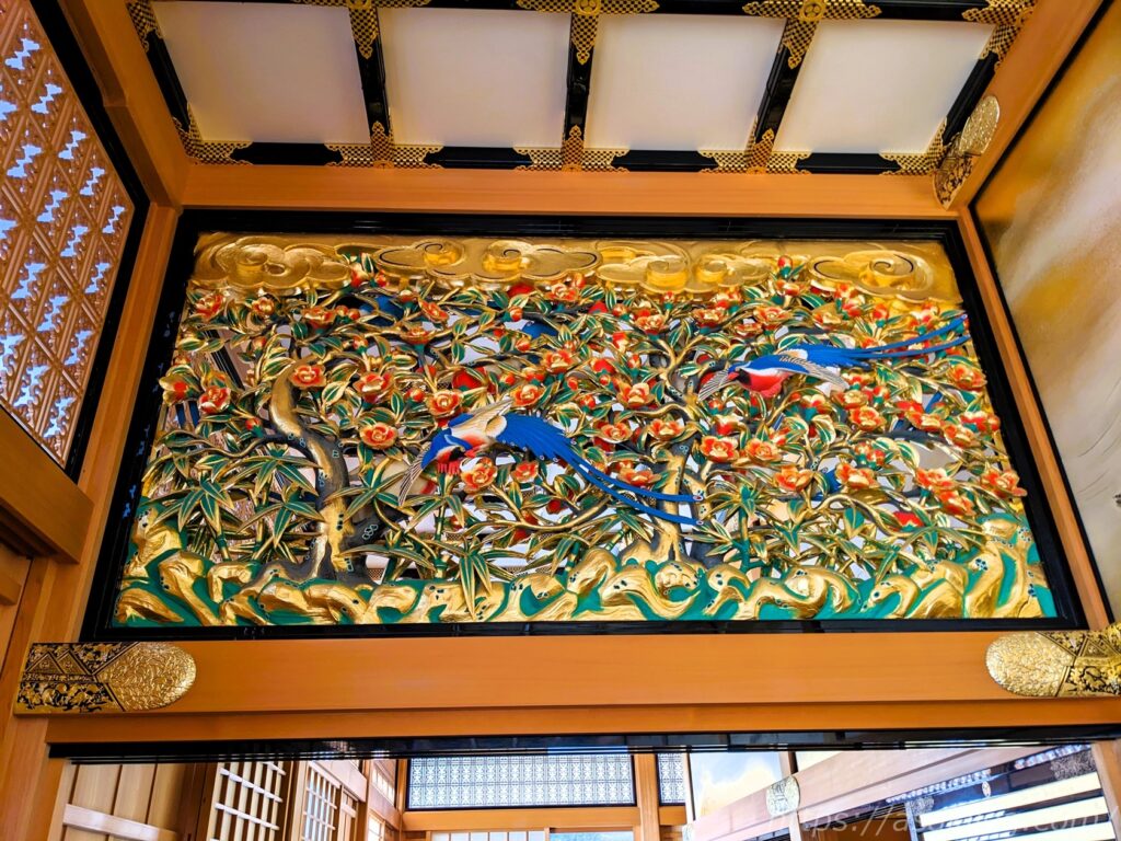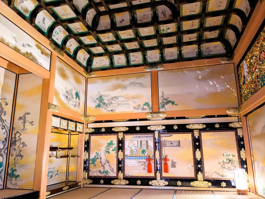 上の写真は将軍の居室・上段之間で、室内の装飾は細部まで贅の限りが尽くされています。幕府御用絵師の加納探幽によって描かれた「帝艦図(ていかんず)」や「雪中梅竹鳥図(せっちゅうばいちくちょうず)」の障壁画・部屋の境の絢爛豪華な彫刻欄間・飾金具など、すべてが煌びやかでゴージャスそのもの。