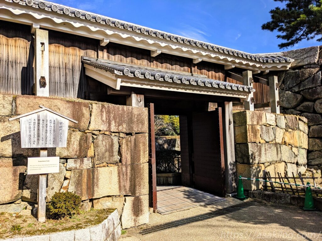 本丸の南端にある築城当時のまま残存する門で、古名は「南二之門」と呼ばれていたそう。柱や扉に鉄板が張られた堅固な造り、門の左右の土塀には鉄砲を撃つための穴(鉄砲狭間)が開いていました。