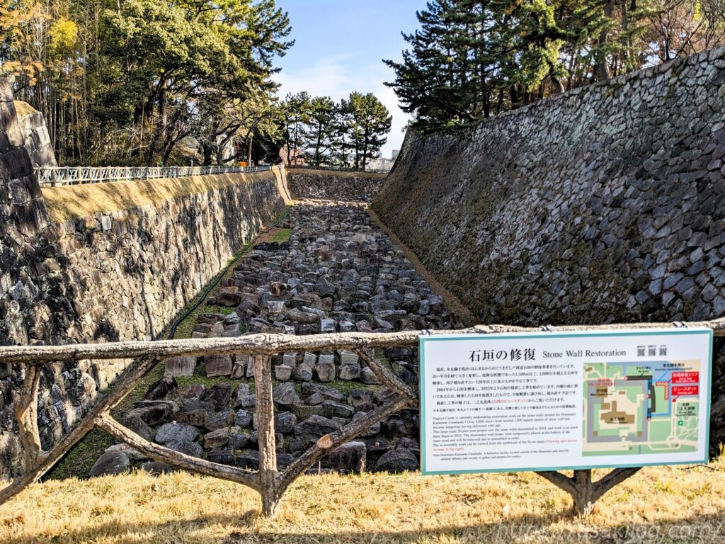 不明門から本丸エリアを出るとすぐに、石垣の修復をしている景色が見られました。長い年月を経て大きく変形し、危険な状態であった1,500㎡以上・4,000石を超える石垣を解体し、再び積み直すという20年以上に及ぶ大がかりな工事なんだそう。2004年~石垣を解体、2023年~石垣の積み直し工事を始めているようです。
