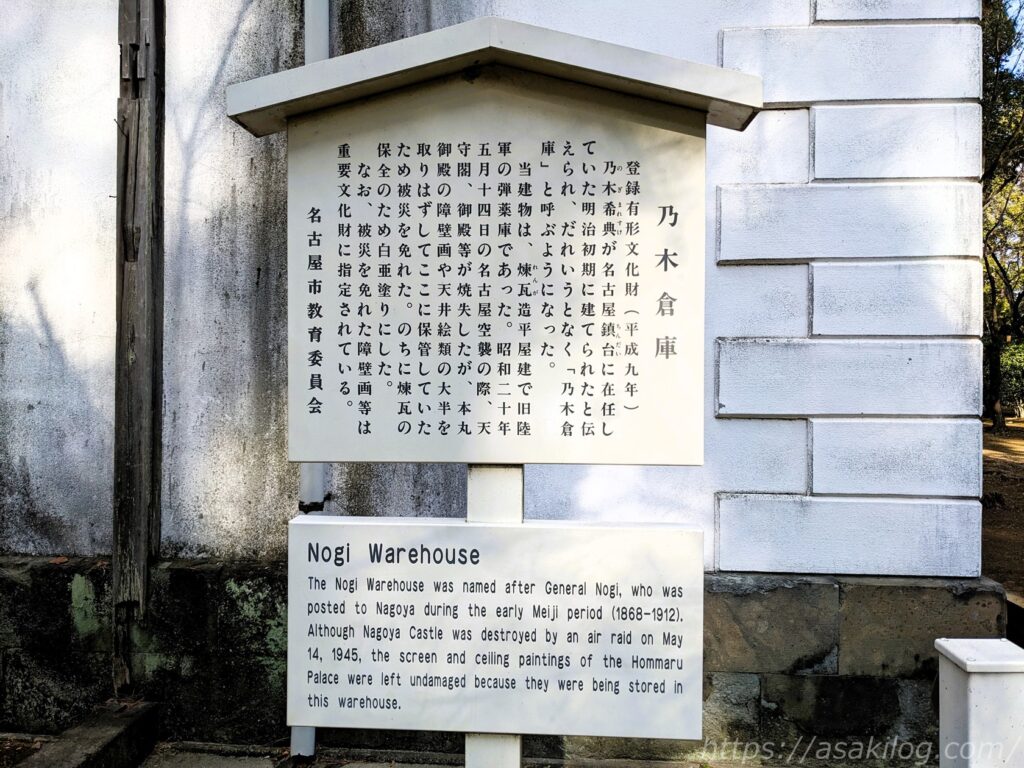 明治初期に陸軍の弾薬庫として建設されたレンガ造りの倉庫で、名古屋鎮台に赴任経験がある乃木秀典大将にちなんで名付けられたそう。名古屋空襲前に、この倉庫へ本丸御殿障壁画を避難させて焼失を防いだことで知られています。内部非公開で、国登録の有名文化財です。