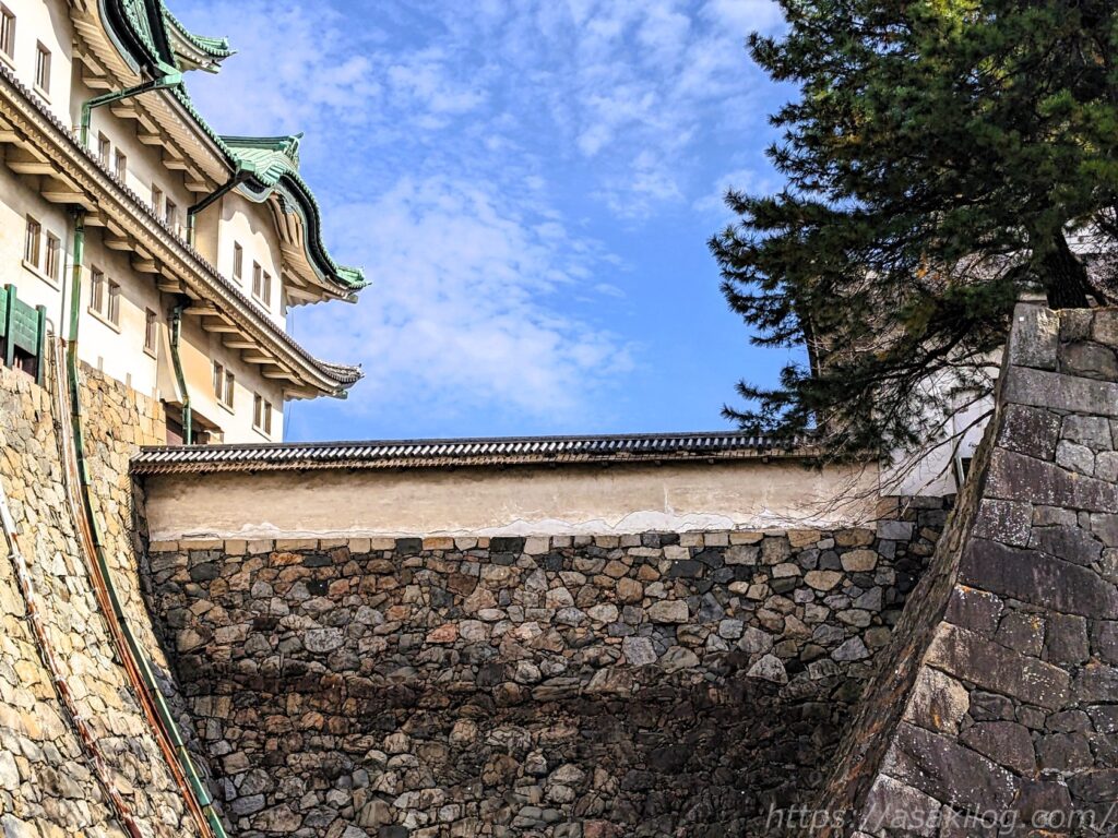そして右側の「東南隅櫓(とうなんすみやぐら)」は、別名「辰巳櫓(たつみやぐら)」と呼ばれています。名古屋城創建当時の建造物で重要文化財。外観の屋根は二層・内部は三階の構造で、出窓には「石落し」を設け、かつて武具が納められていたそう。内部非公開なのが残念でした。