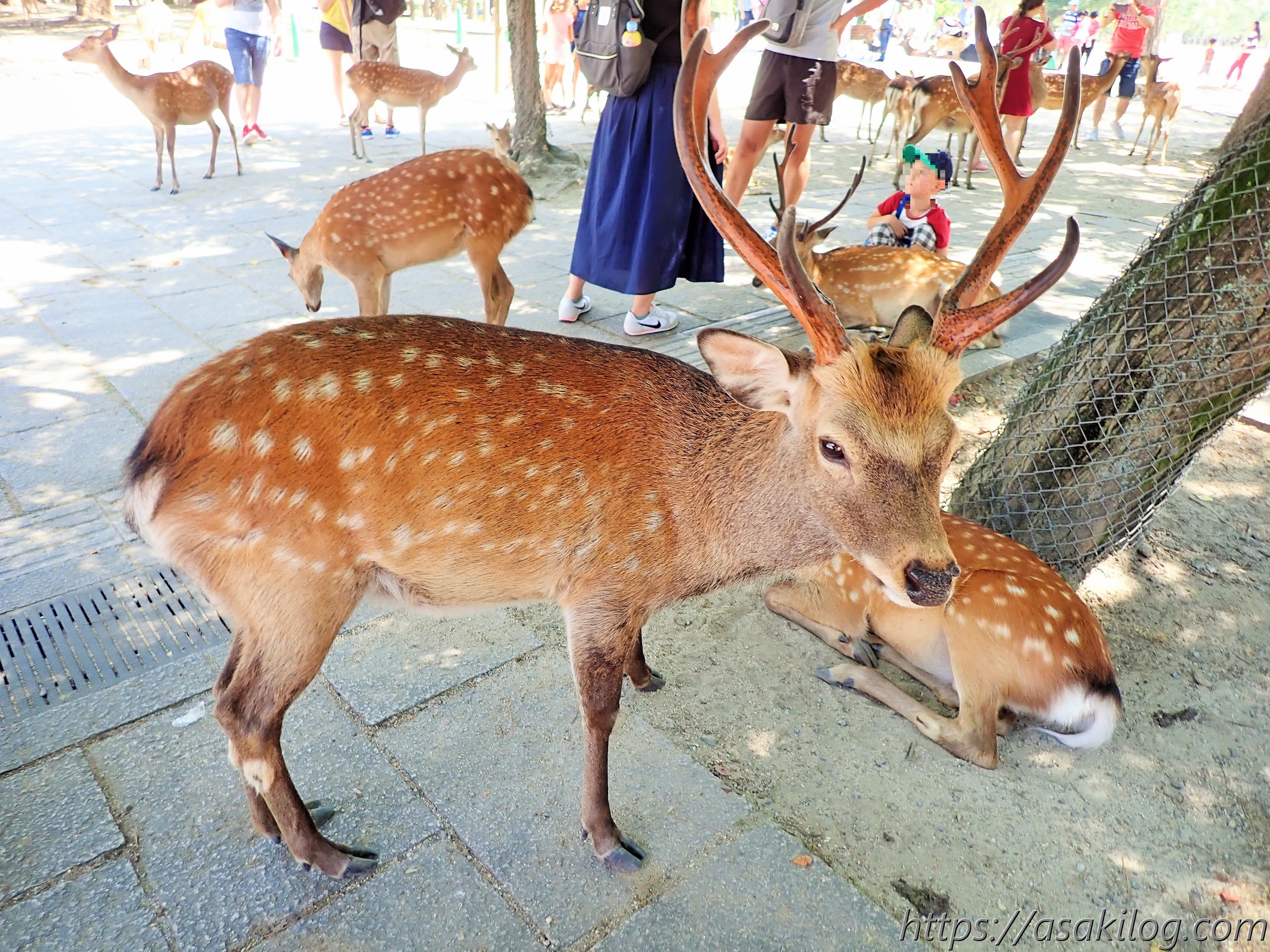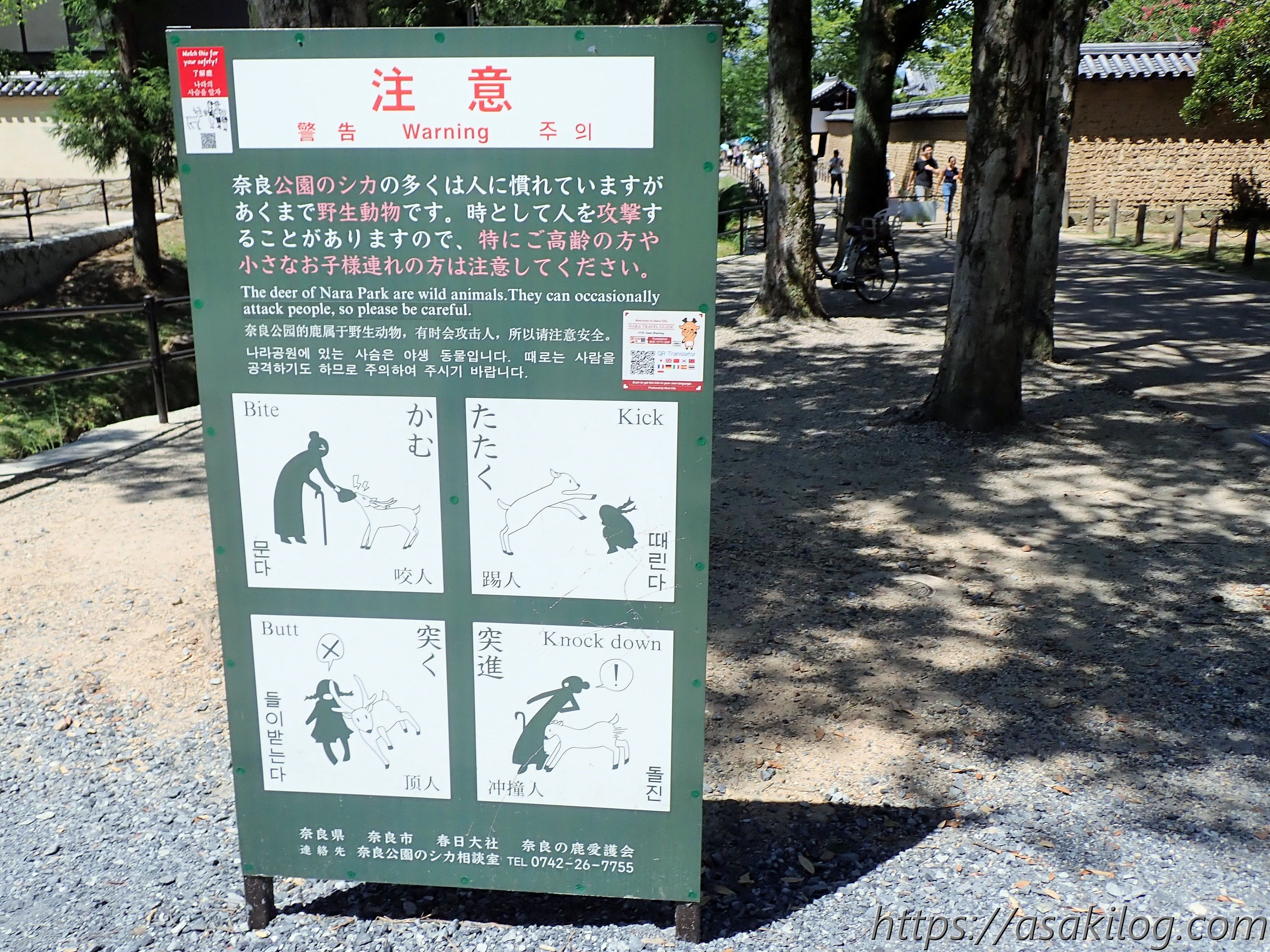 「奈良公園のシカの多くは人に慣れていますがあくまで野生動物です。時として人を攻撃することがありますので、特にご高齢の方や小さなお子様連れの方は注意してください。」とのこと。