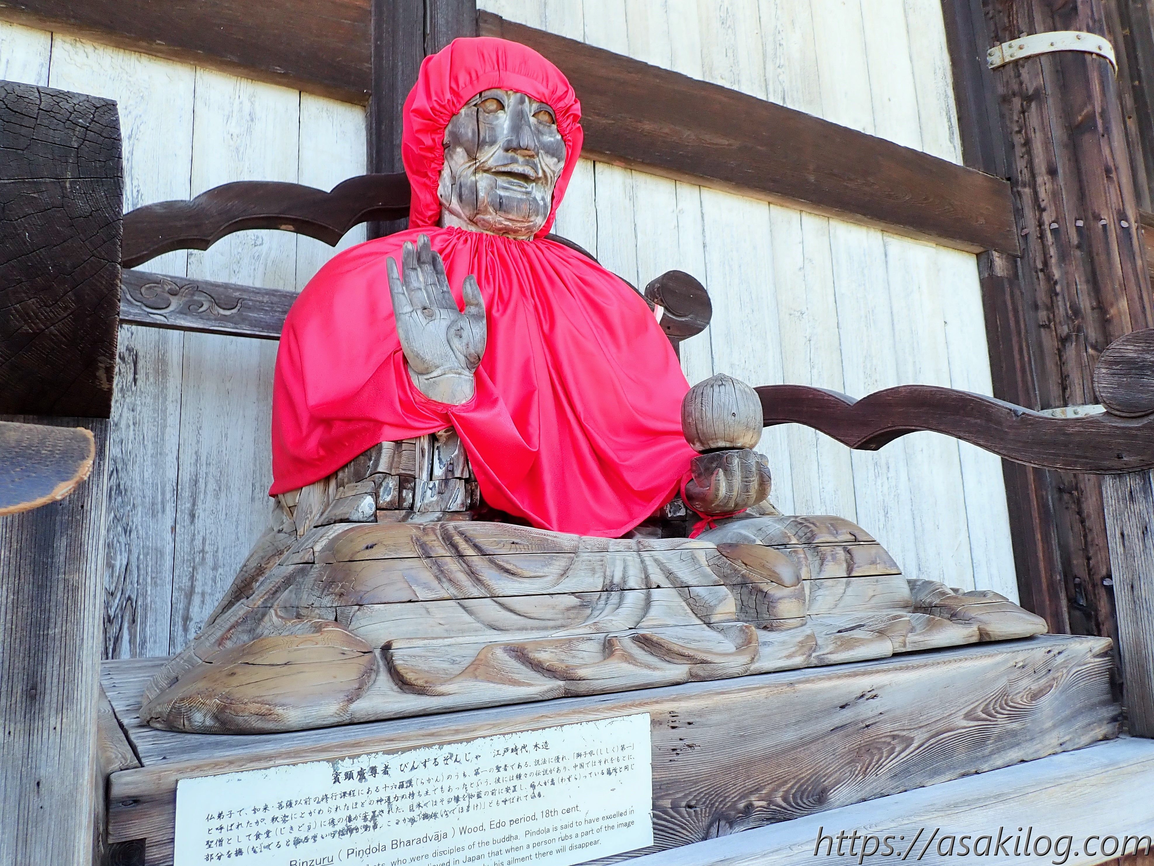 そして大仏殿の外に出たところにあったのが「賓頭盧尊者像(びんずるそんじゃぞう)」。「なで仏」とも呼ばれています。病を患っているのと同じ場所をなでると病気が治るとか。私は腰痛・頭痛があるので、腰のあたりは撫でられましたが、頭の方までは届かない高さでした。