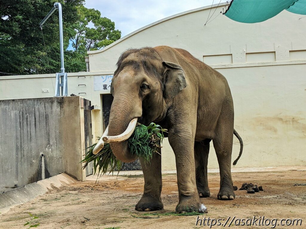 入ってすぐ正面、いつも最初にアジアゾウがお出迎え。ちょうどお食事タイムでした。