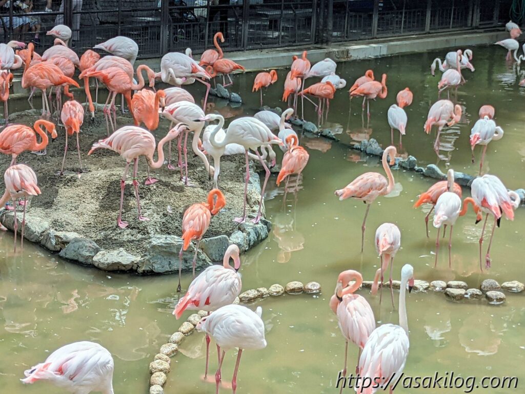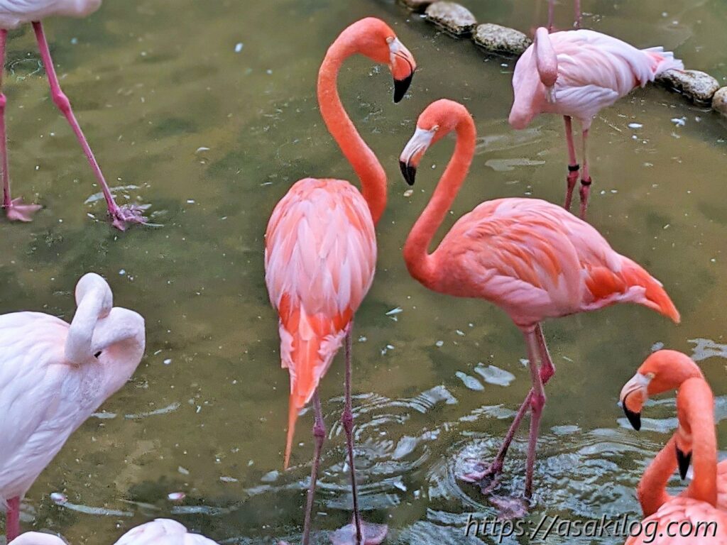フラミンゴは、色鮮やかな紅色の「ベニイロフラミンゴ」と、白く桃色の「ヨーロッパフラミンゴ」の2種類です。くちばしで小さな水生植物や水生動物をこして食べるらしい・・・いつ見ても不思議。
