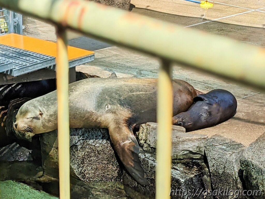 こちらはカリフォルニアアシカ。親子でスヤスヤとお昼寝中です。