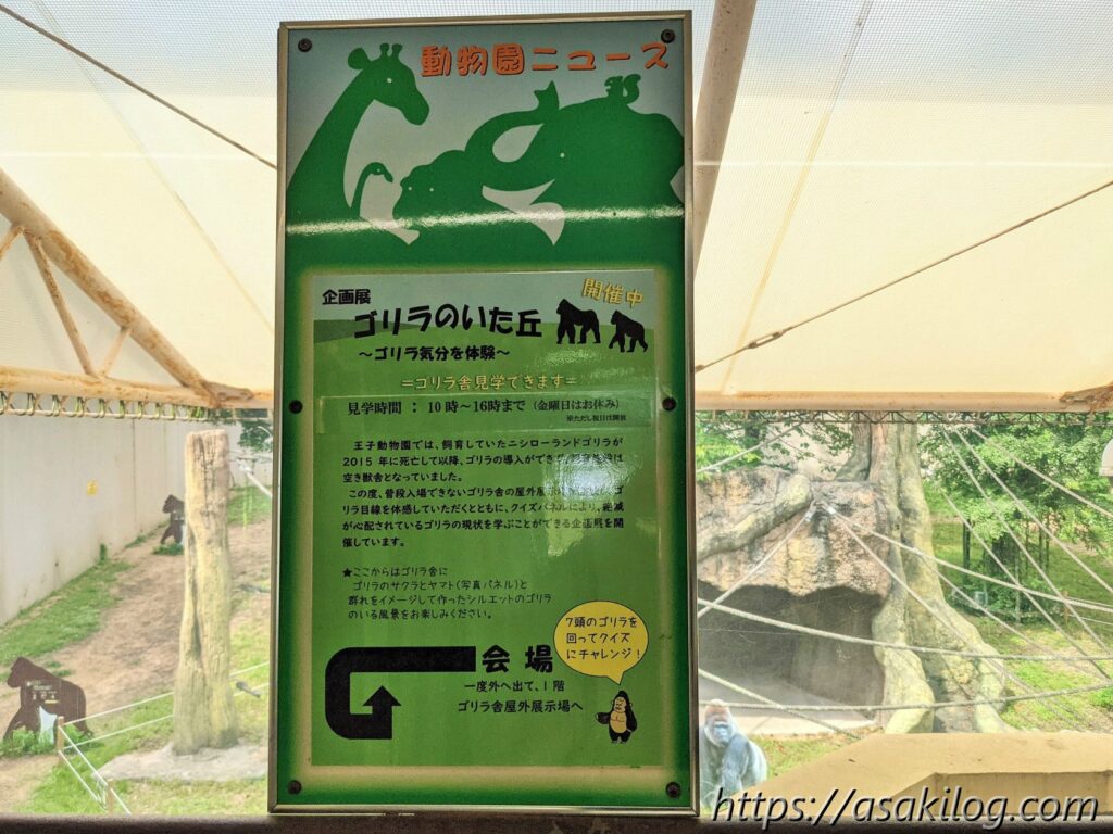 王子動物園では、かつてゴリラも飼育していたのですが、2015年に亡くなって以来、空き獣舎となっています。今現在は「企画展ゴリラのいた丘~ゴリラ気分を体験~」を開催中で、ゴリラ舎屋外展示場に入れるそう(この日とても暑かったため、私は写真撮影だけ)