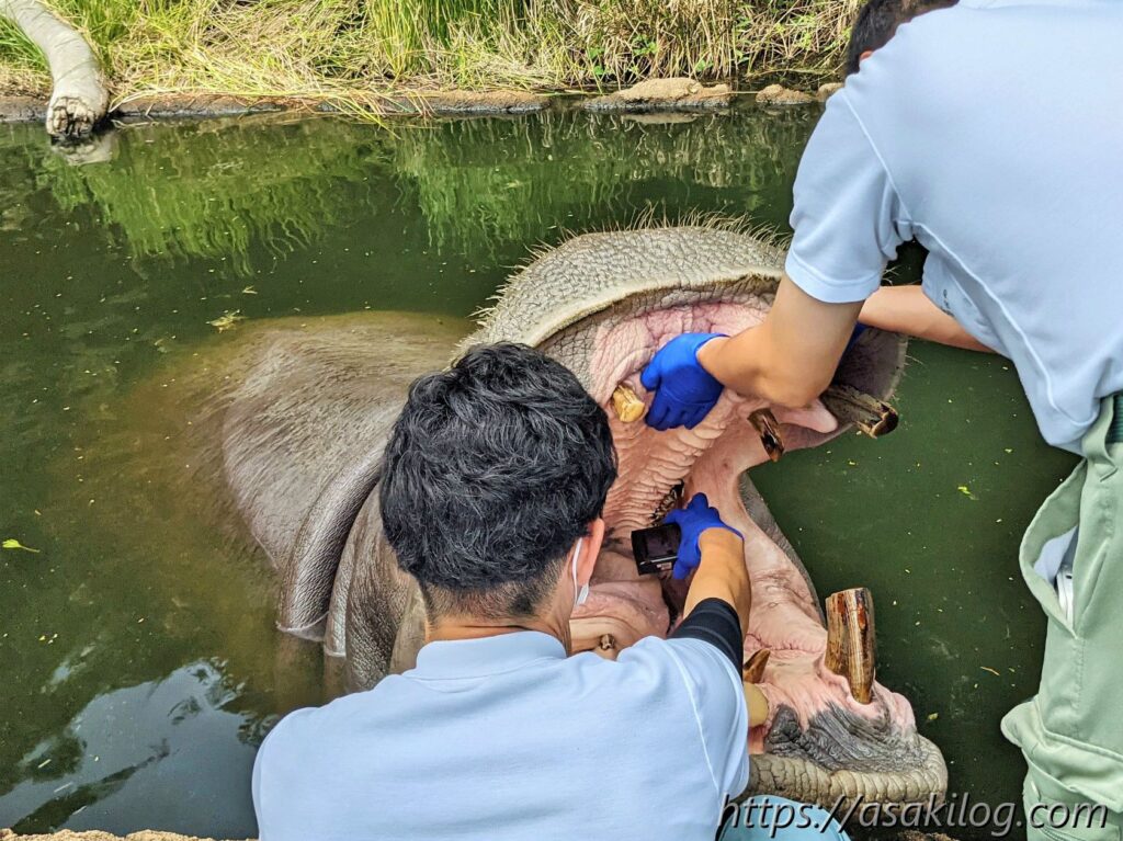 王子動物園では定期的に口の中の健康チェックを行っているそう。獰猛で危険だと言われるカバの口の中に、がーっと手を突っ込んでメンテナンスする飼育員さんすごい!びっくりして目が離せませんでした。
