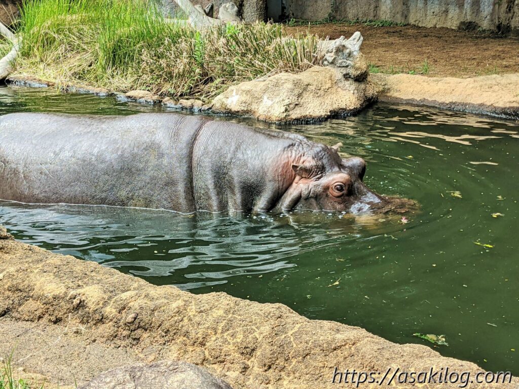 飼育員さんによる健康チェック終了後、すいすいと泳ぐカバの出目男。おつかれさまでした。