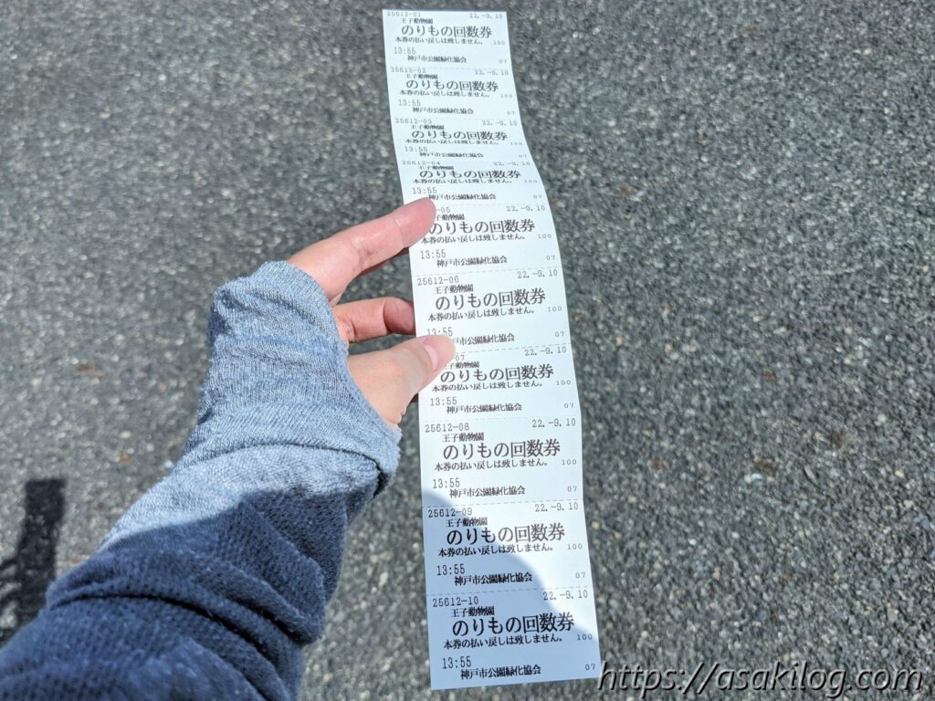 王子動物園の遊園地は、事前にのりもの券を購入し、乗りたいアトラクションに必要な枚数を渡します。今回私は「のりもの回数券10枚綴り1,000円」を購入しました。