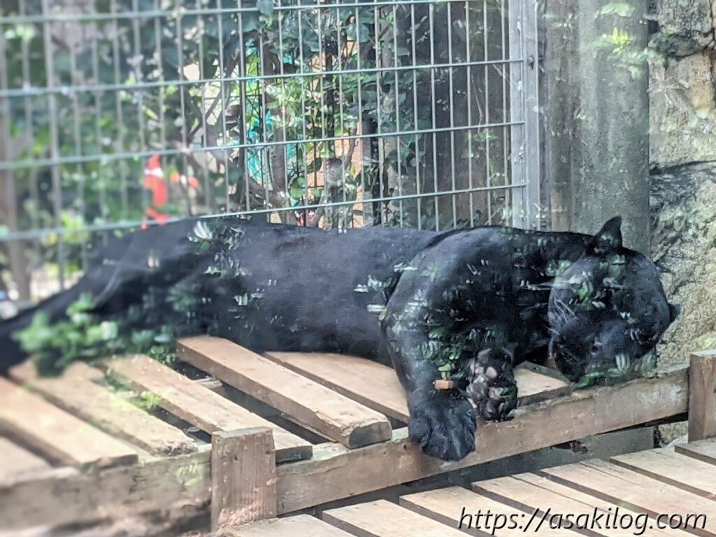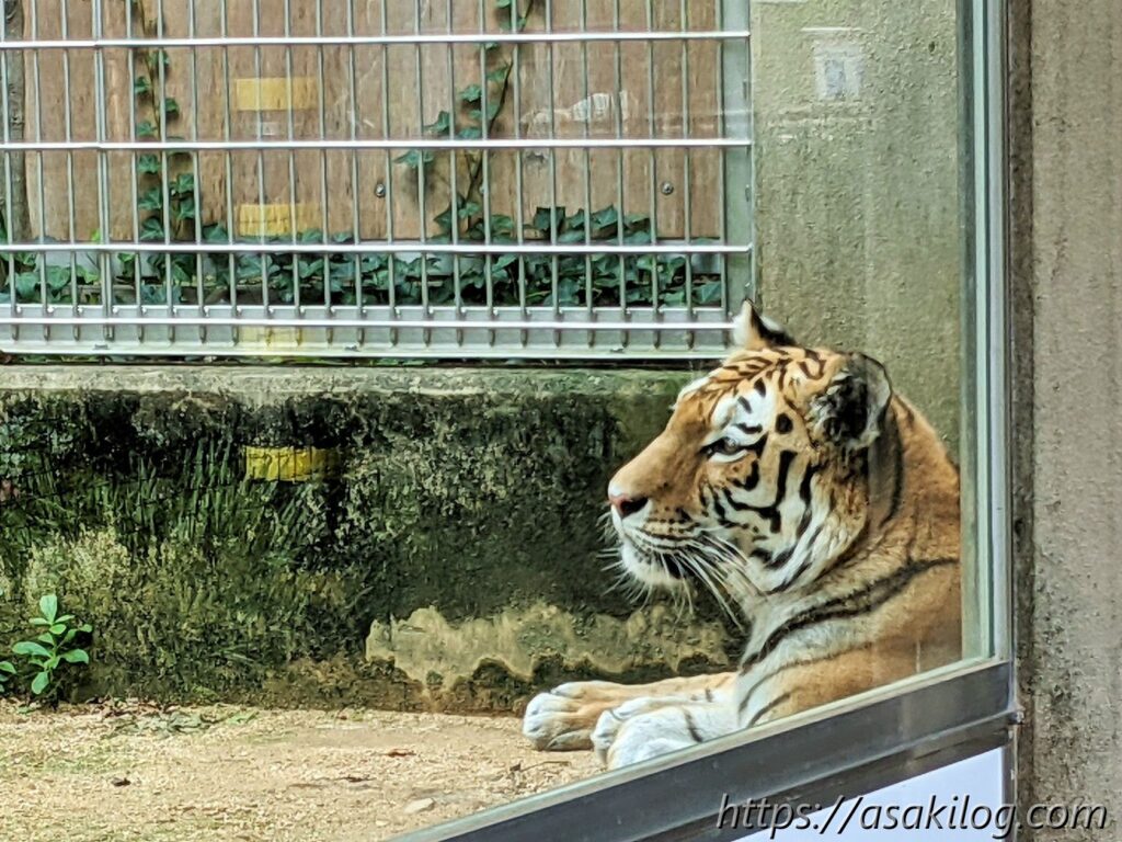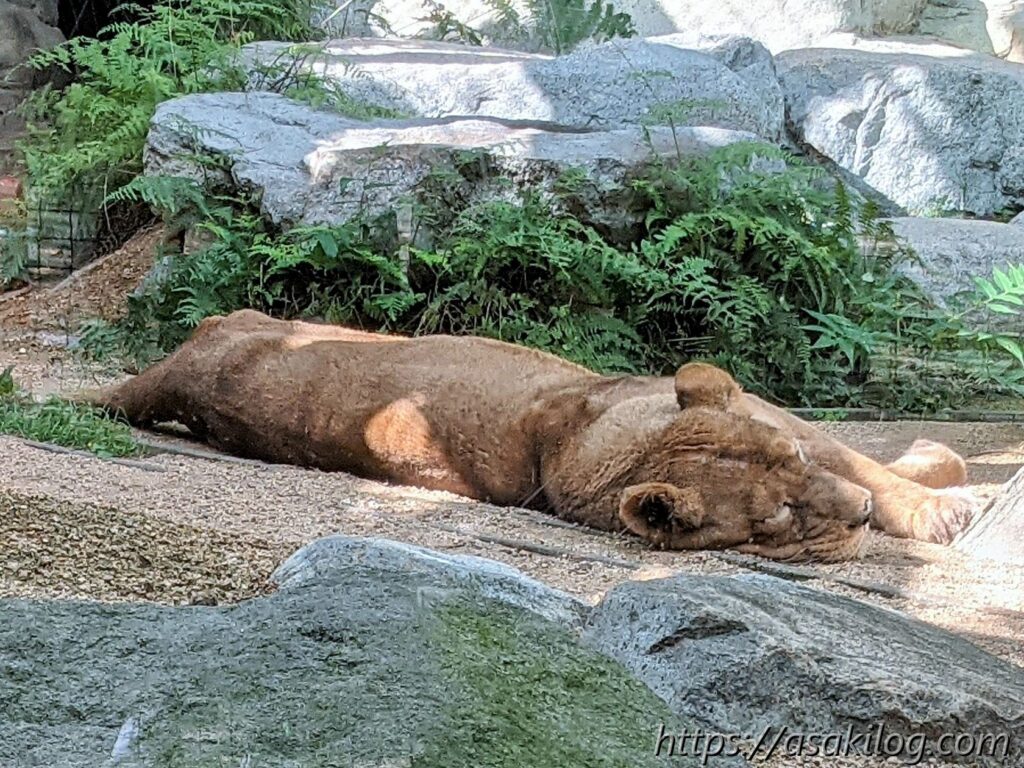 王子動物園の猛獣コーナー。ここにいる猛獣たちはいつも寝ている気が・・・暑いから?時間的なもの? ライオン・ジャガーはぐっすりお休み中。アムールトラは、ボォーッとどこかを見つめていました。
