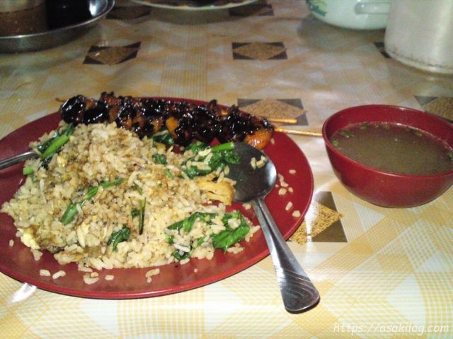 ナシゴレン3.5RMくらい+サテー1.2RM*2本。合計170円くらい。安っ! お腹いっぱい。