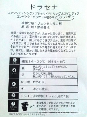 ドラセナ・レフレクサ プリオメル 2009/8/9 2018/1/31 日常 シェアする LINE! ※本サイトでは広告が含まれる場合があります。 実は長らく我が家のリビングに置く観葉植物を探してまして、先日、ついに、これ買っちゃいました。その名も、ドラセナ・レフレクサ プリオメルです。 説明書は、こんな感じ。 室内園芸に向いていて、私よりも背が高く、葉っぱがいっぱい、・・・なのを探していたのですが、ついにゲット!これから楽しみです。