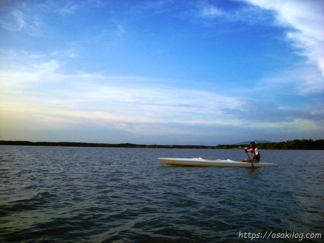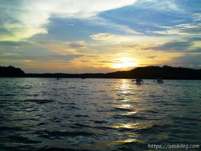二人乗りカヤックの前に乗りました。太陽に向かって進んでいきます~。ちなみに、前⇒下手な人、後⇒上手い人・・・がよいらしい。(私、一応経験者なのに、前~!!まぁ下手だから何も言い返せないけど。)