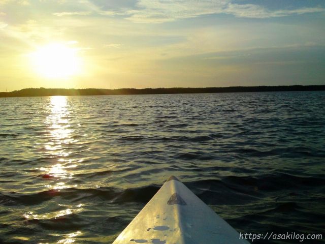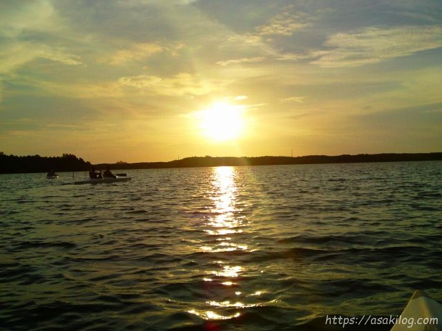 だいぶ夕日がまぶしくなってきて、水面もオレンジ色に染まってきました。