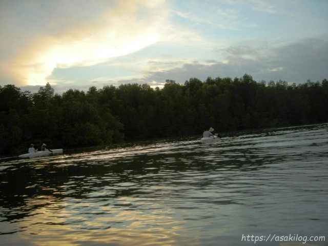 さてさて、オレンジ色の夕日が落ちた後も、カヤックツアーは続きます。マングローブをひたすら漕いで、漕いで・・・