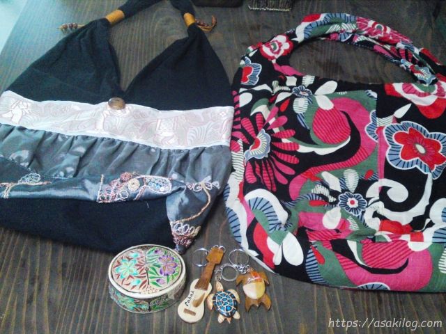 布地のかばんを2つ。これからの季節に大活躍します!プラス、可愛い模様の小物入れと、キーホルダー。