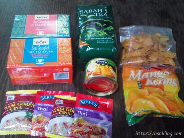 10年前から大のお気に入りだったBOHティー、コタキナバル特産のサバティー、ココナッツジャム(Seri Kaya)の缶詰、ドライマンゴーとバナナチップ。ナシゴレンの素。