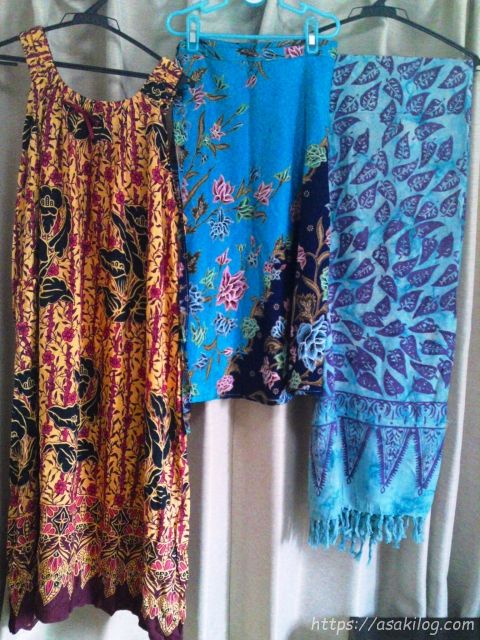 ロングのワンピース(真夏の寝巻きとして大活躍です)膝下丈の巻きスカート、おしゃれな柄の布(いろいろと使えます)