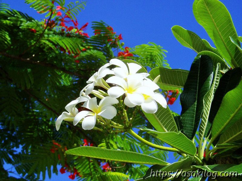「プルメリア」の花もよく見かけます。青空+プルメリアも美しい。