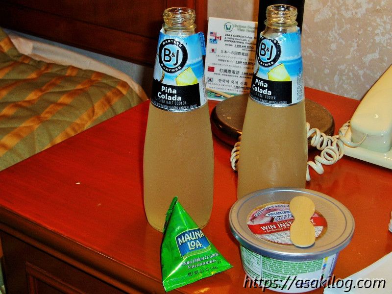 ホテル近くのスーパーで買い物して、定番の部屋飲みも。