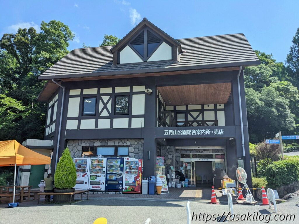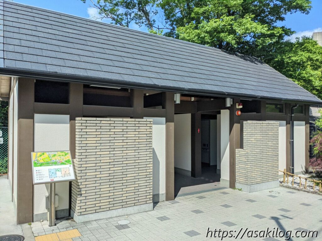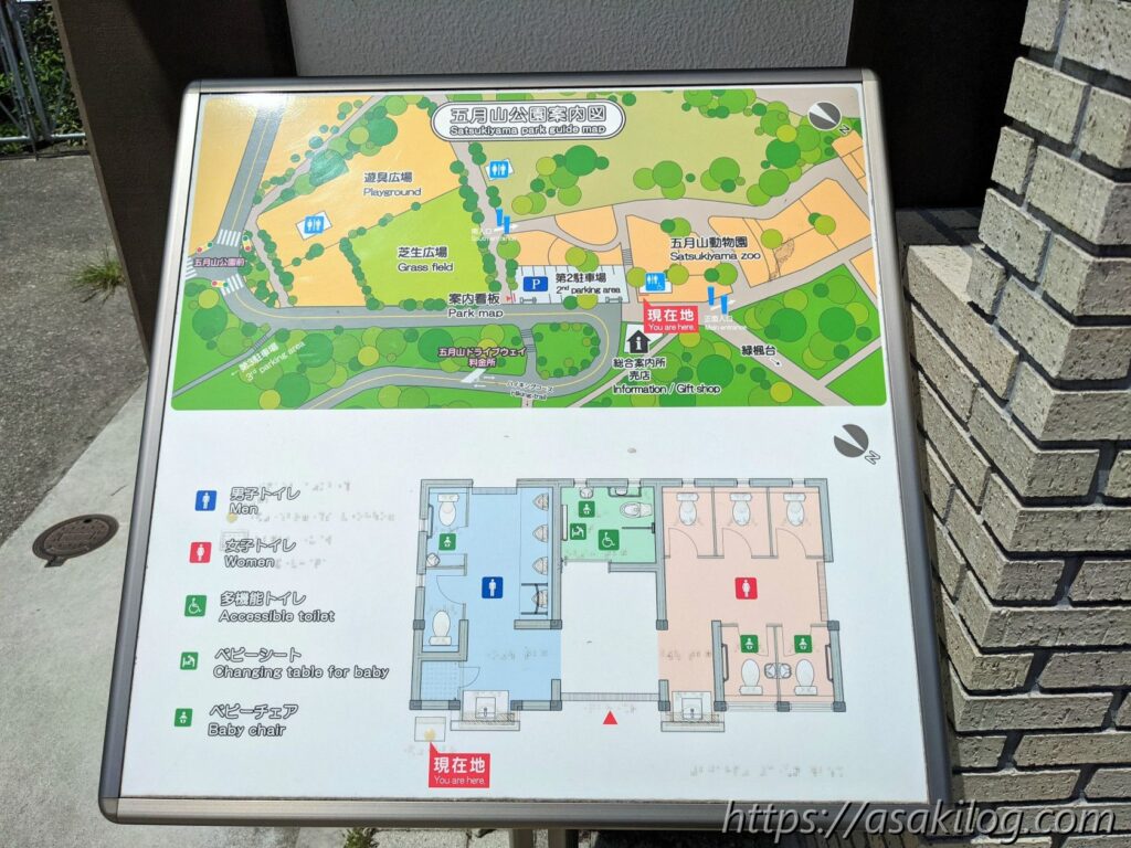 駐車場近くにトイレがあるので、入園前に利用しましょう。右の写真は五月山公園の案内図。