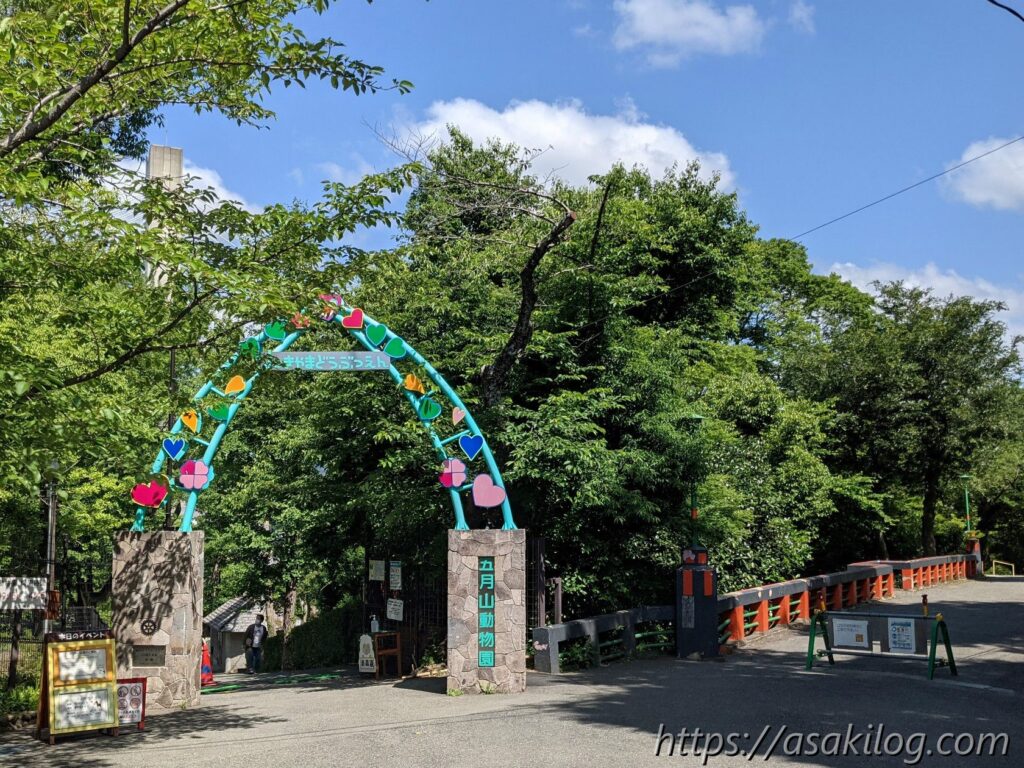 五月山動物園の入口はこちら。可愛らしい緑のオブジェの下から入ります。なんと!入園無料ですよ~!