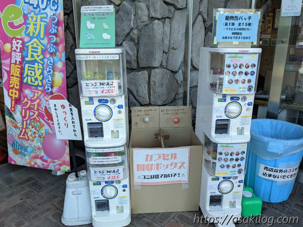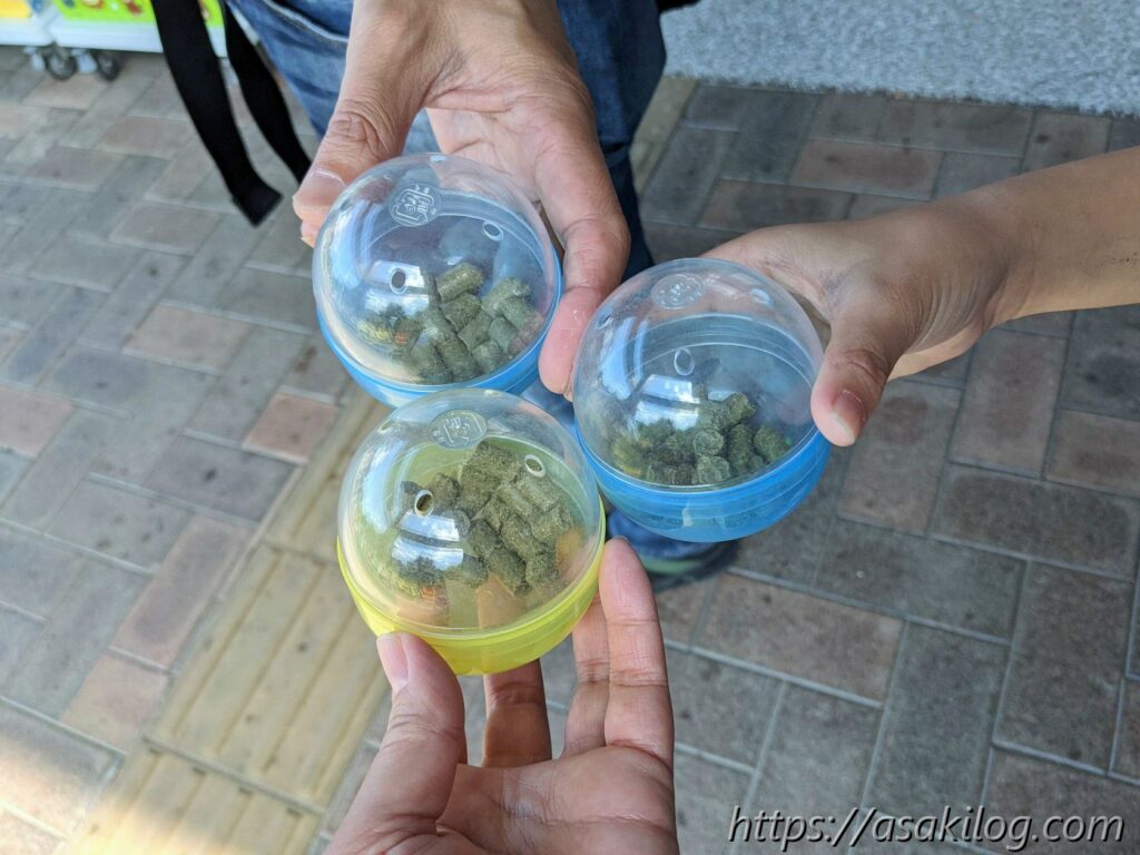 動物の餌は1カプセル200円。私たちは1人1カプセルずつ・家族3人分購入しました。空っぽになったカプセルは、売店前 または 園内のカプセル回収BOXに入れてくださいね。