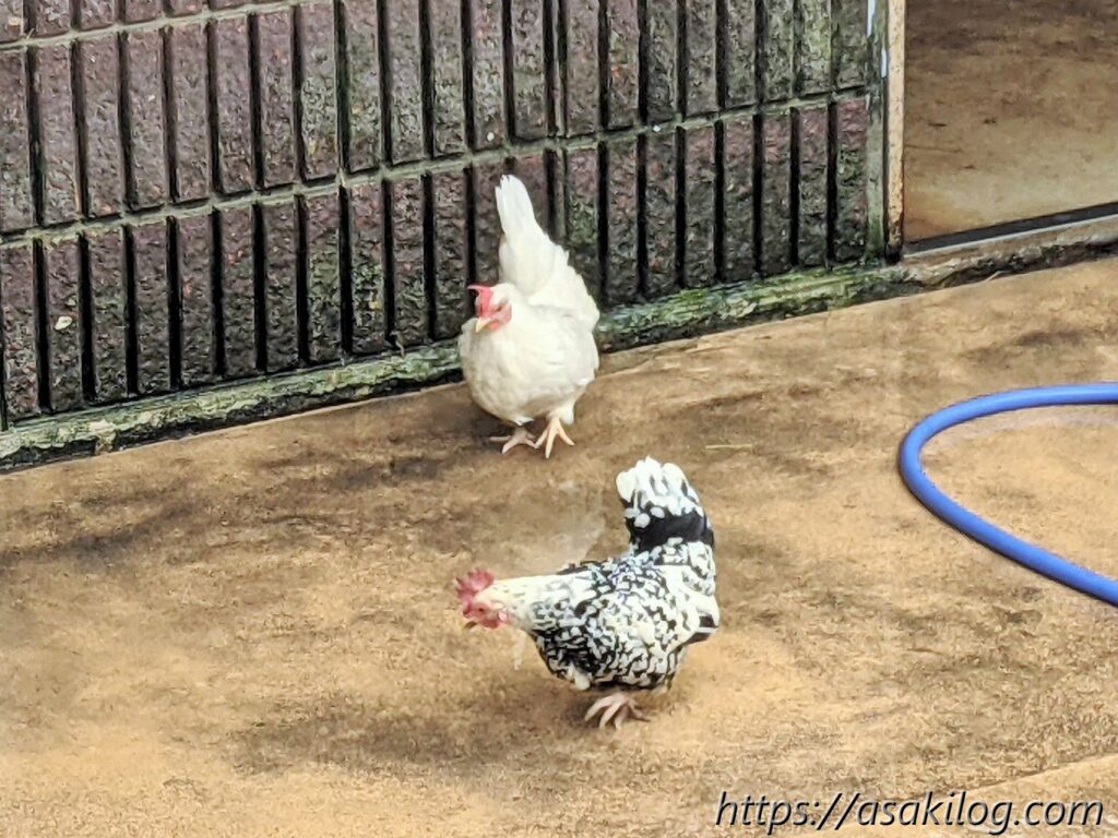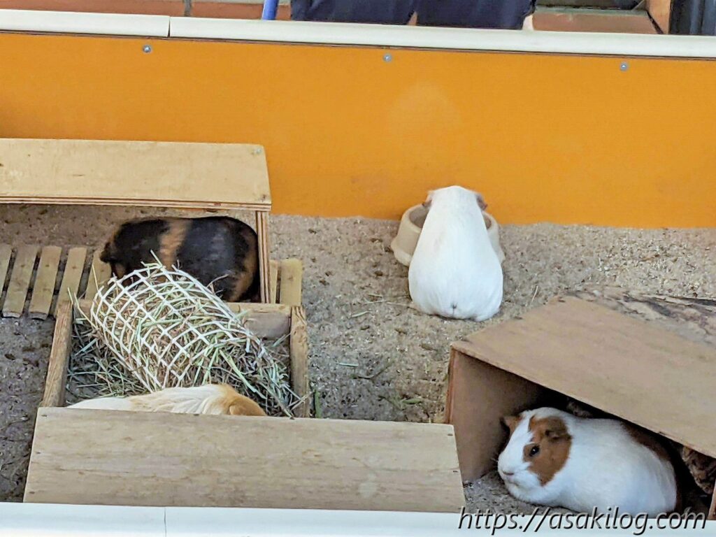 うさぎ、にわとり、モルモットなど。青いホースがあるのはお掃除中だったから!