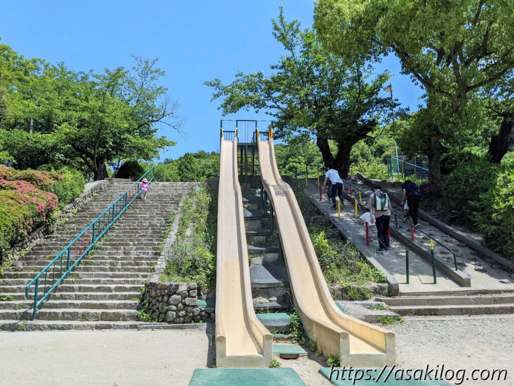 こちらの急な滑り台でした。滑り方によっては、かなりスピードが出て転んでる人も! うちの娘は慎重なビビリタイプなので、さりげなく手すりブレーキで、ゆっくり滑っていました。