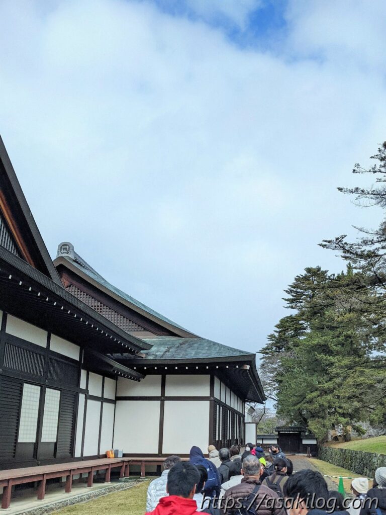 この日は、ひこにゃんが13:30~彦根城博物館(冠木門)に登場する予定だったため、彦根城博物館入口前で待機。登場時間が近づくと門が開いて中に入ることができ、ずらりと並びます。(奥の扉からひこにゃんが登場するのを知らなくて出遅れました)