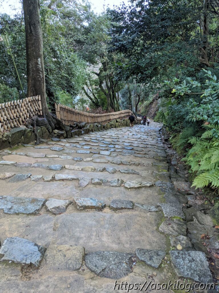左の写真は登る前に下から撮影、右の写真はある程度登った後に上から撮影したもの。かなり急な坂道なので、歩き慣れた靴がおすすめ!この日は時々小雨が降っていたため滑りそうで少し怖かったです。杖をついて昇り降りするお年寄りも見かけましたよ。