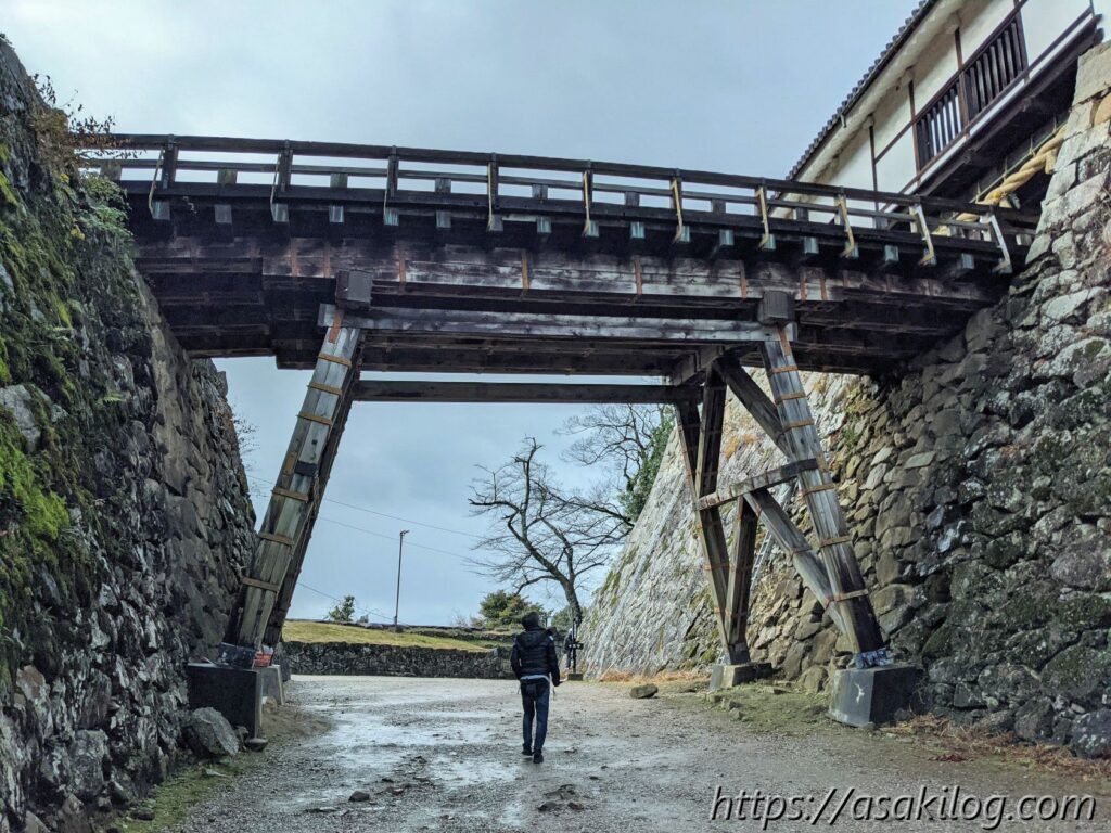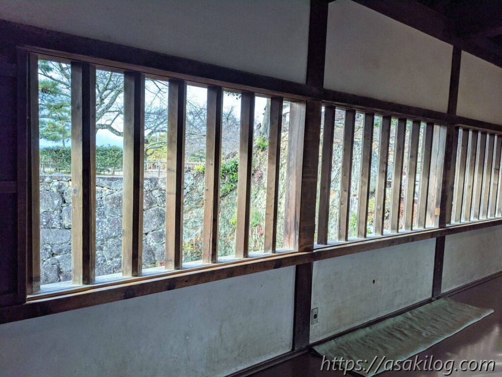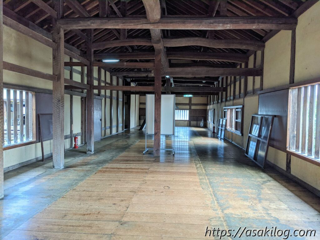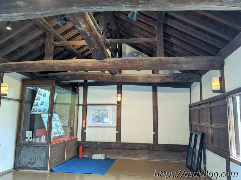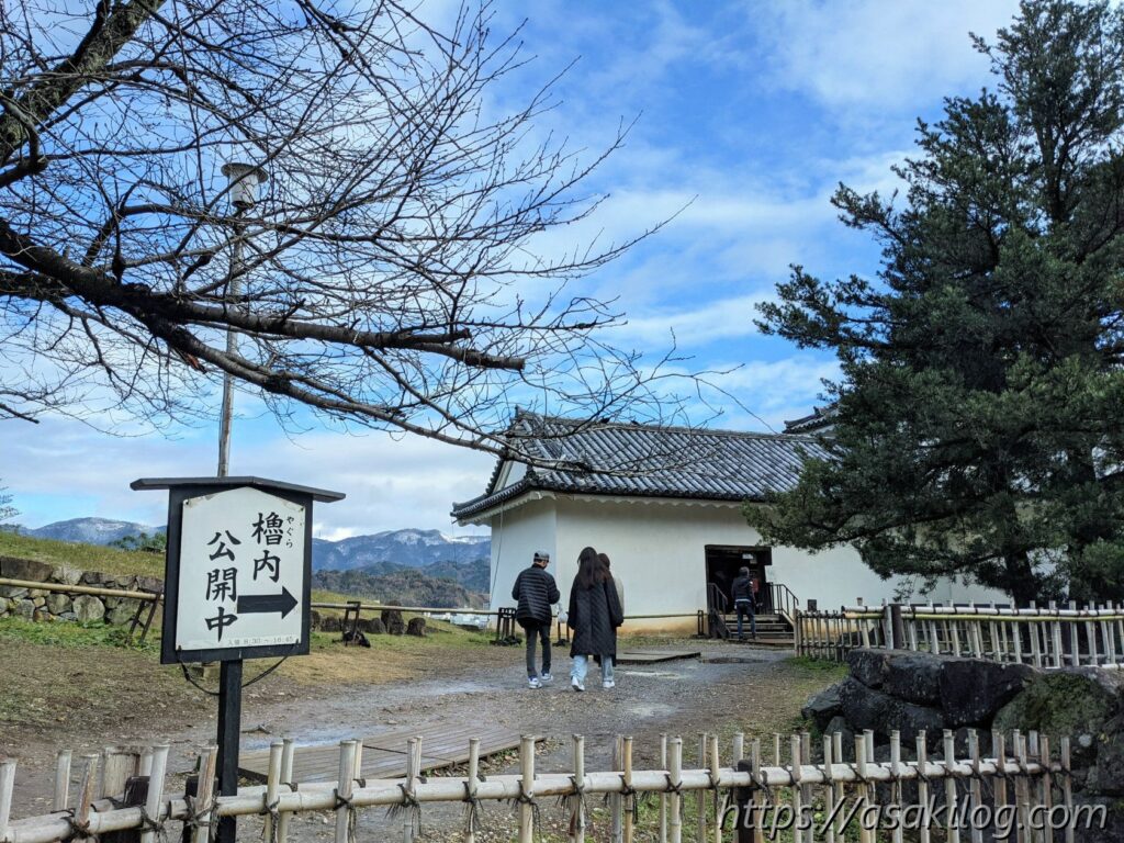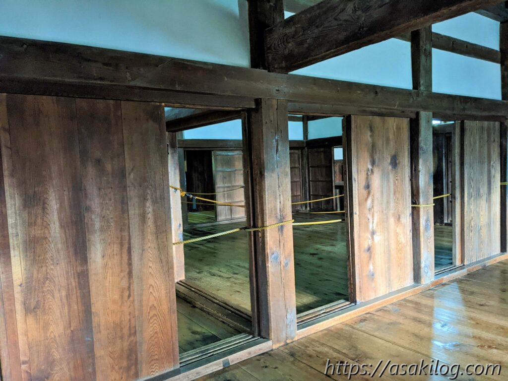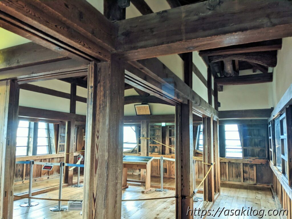太鼓門をくぐった先で櫓の中を公開していました。建物背部は開放された高柵付きの廊下で、櫓としては大変珍しい構造になっています(中央の写真)。