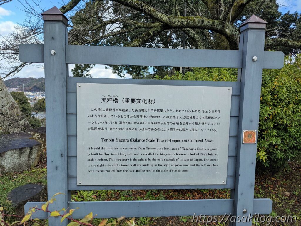天秤櫓は廊下橋に接続する櫓門部分を中央に、両坂道に面する多聞櫓の角を二重櫓とすることで左右対称に建てられていることが名前の由来。天秤のような形をしているところから天秤櫓と呼ばれています。この形式のものは日本の城郭で彦根城だけですが、豊臣秀吉が創築した長浜城大手門から移築したものと考えられているそうです。