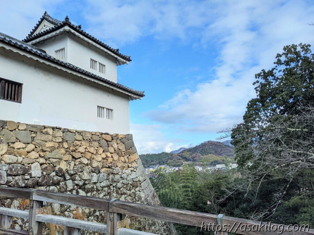 表門山道を登った先の「天秤櫓(てんびんやぐら)」、実は表門・大手門の両坂道を登りつめたところにあります。表門山道・大手門山道から登ってきた敵兵は、天秤櫓の高い石垣を登らないと本丸へ侵入できないという重要な拠点で、西の丸の西側に建つ櫓。西方の搦め手(裏手)からの敵に供えた守りの要で、国の重要文化財に指定されています。