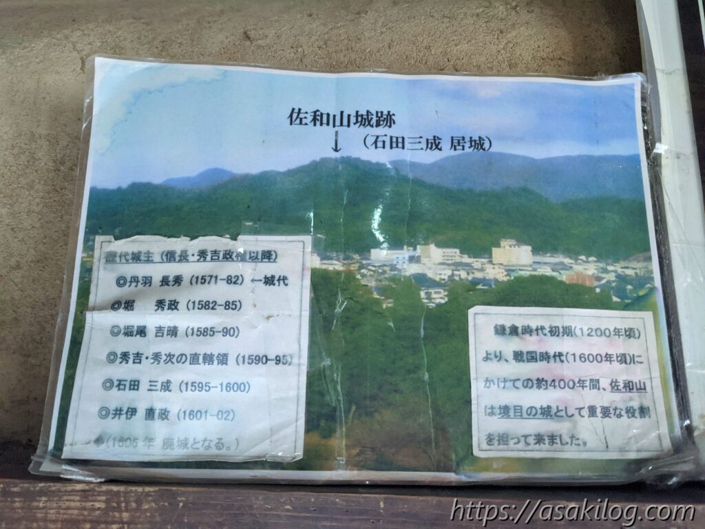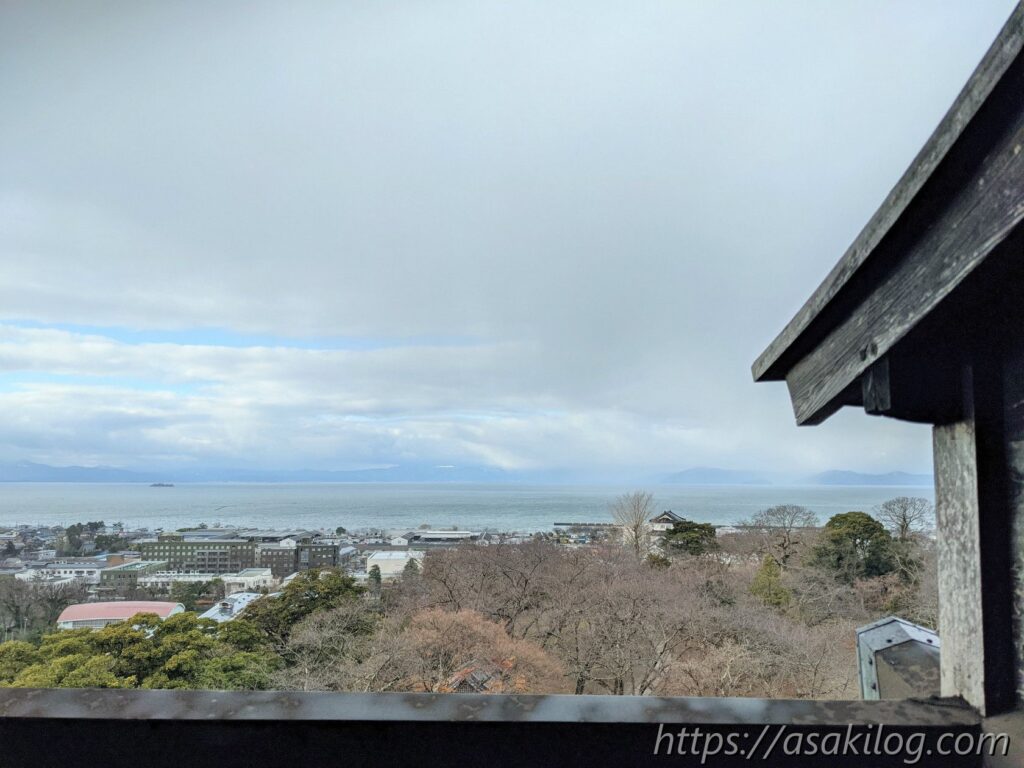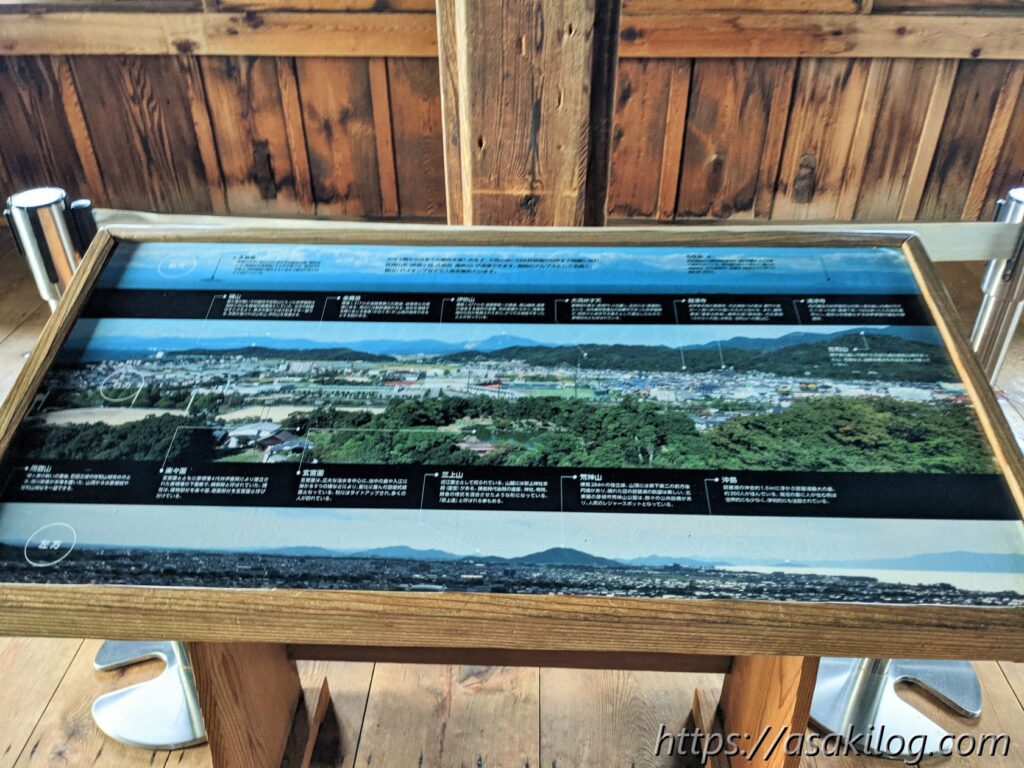 ここから見える眺望の写真・説明もあり、左の写真は琵琶湖方面。この日は小雨が降っていたので曇っていましたが、晴天時はもっとよい景色を期待できそうです。