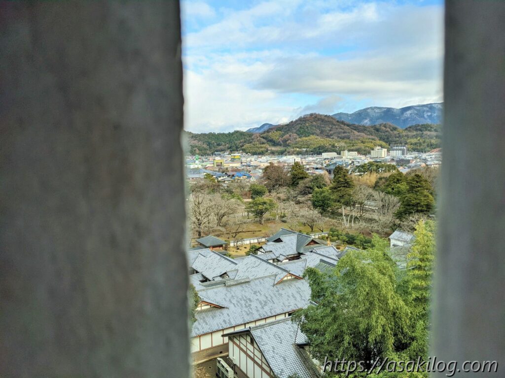 天秤櫓内の窓から、写真を参考に佐和山城跡を探したり。(同じ形のお山がありました!)