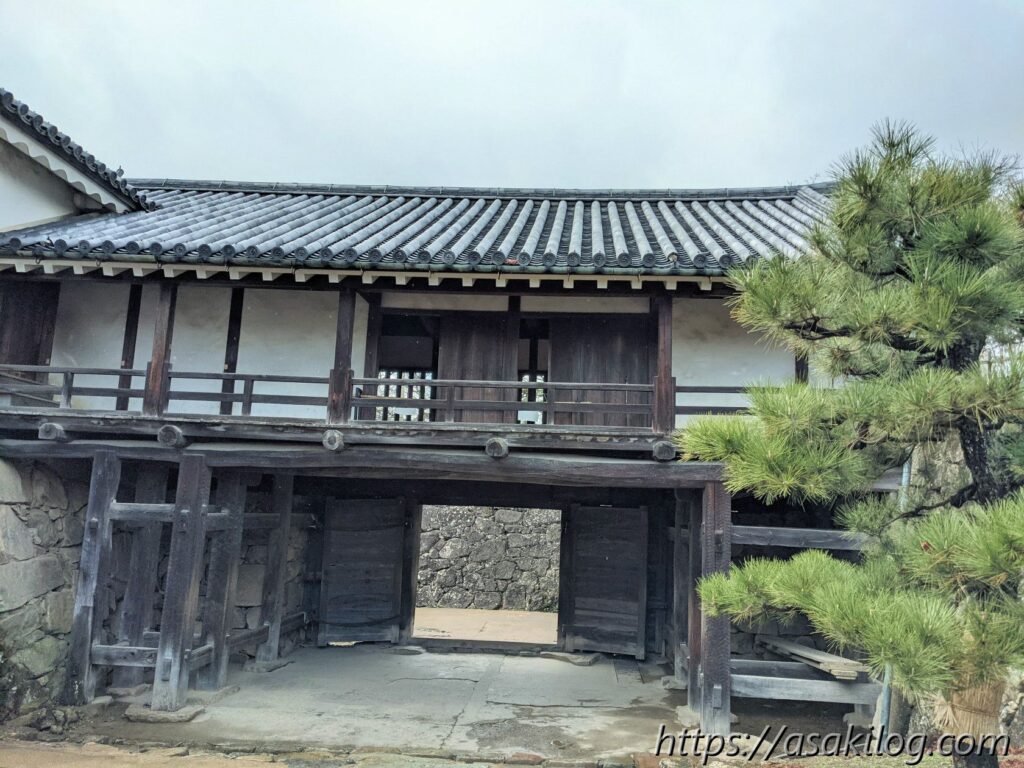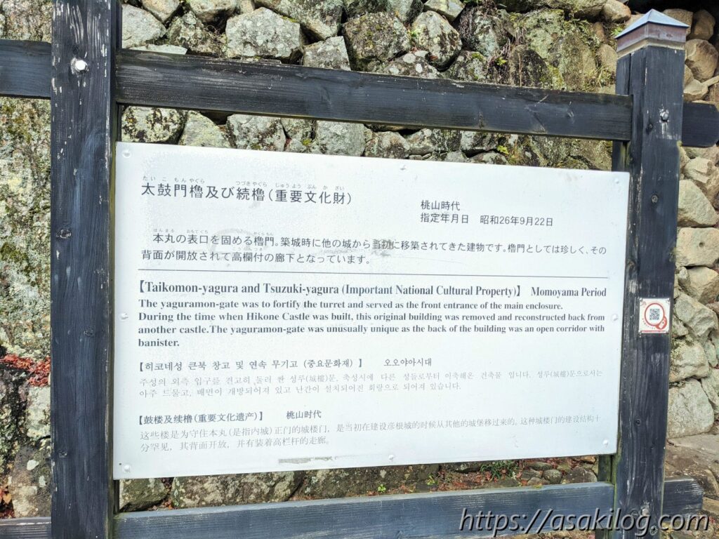 続けて見えたのが「太鼓門 及び 続き櫓(たいこもん および つづきやぐら)」。こちらも国の重要文化財に指定されています。