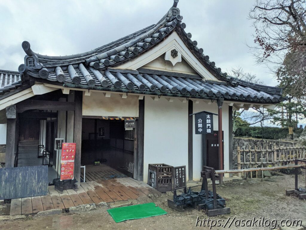 天守のある本丸表口をかためる櫓門で、ここで城内合図の太鼓を鳴らし登城の合図をしていたことから「太鼓門」と名付けられました。解体修理に伴う部材調査により、築城時にどこか他の城から移築したものだと判明しているそう。