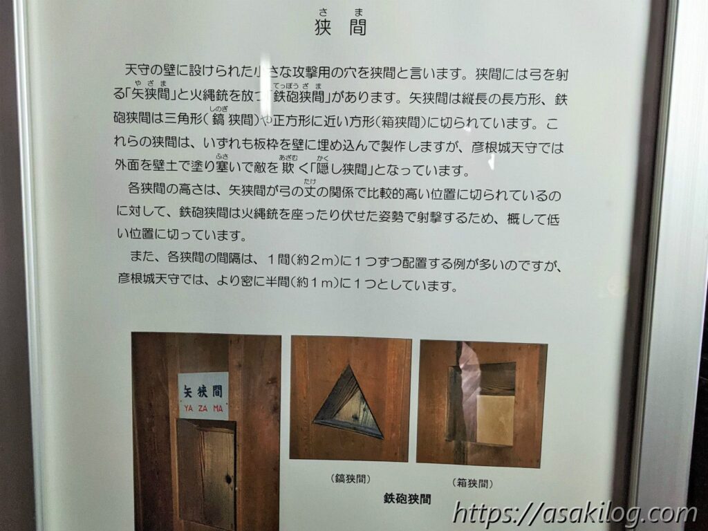 狭間は板枠を壁に埋め込んで製作しますが、ここ彦根城の天守では平日は外から見えないように外面を漆喰壁で塗りふさぎ、先日は壁を突き破って敵を欺くための「隠し狭間」となっています。