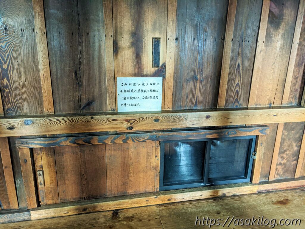 彦根城の天守内には、4~5人が入れる広さの隠し部屋が2階の東西・3階の南北の計4カ所あり(ただし隠し部屋としての意図があったのかは不明)、右の写真の板戸の中にも千鳥破風の屋根裏を利用して1室が設けられているようです。