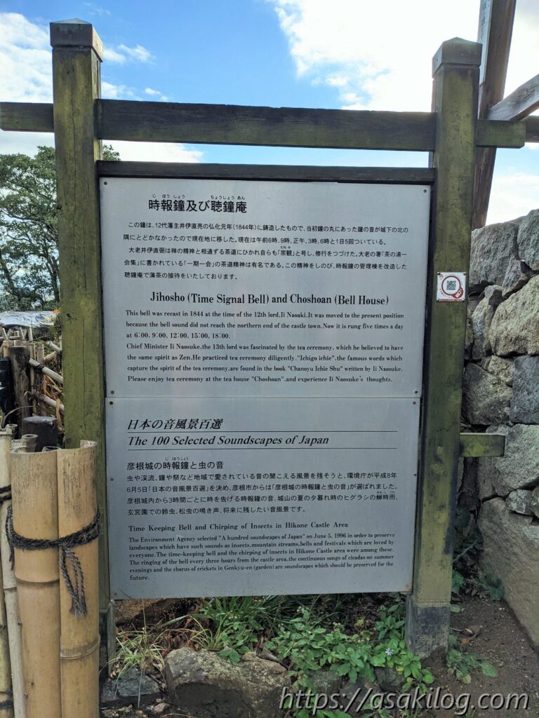 「時報鐘(じほうしょう)」の鐘は、12代藩主・井伊直亮が弘化元年(1844年)に鋳造したもの。当初鐘の丸にあったものを、城全体に響くようにとこの場所に移されました。今でも定時(午前6時・9時・正午・3時・6時)の1日5回鐘をつき、「日本の音風景百選」にも「彦根城の時報鐘と虫の音」として選ばれています。