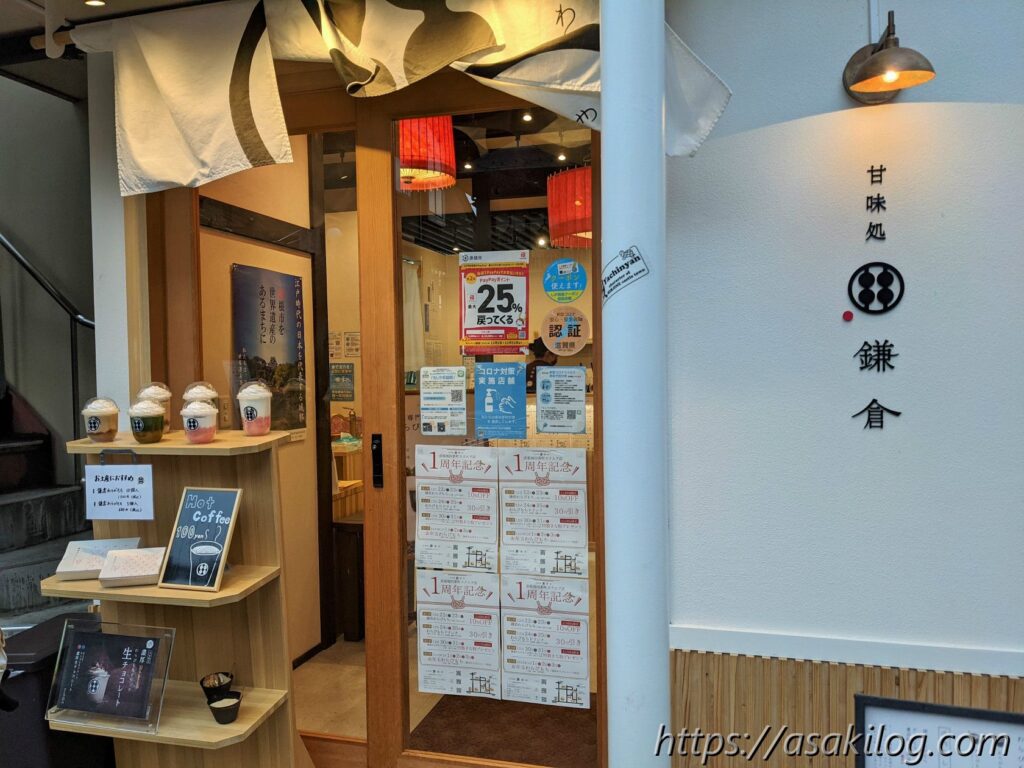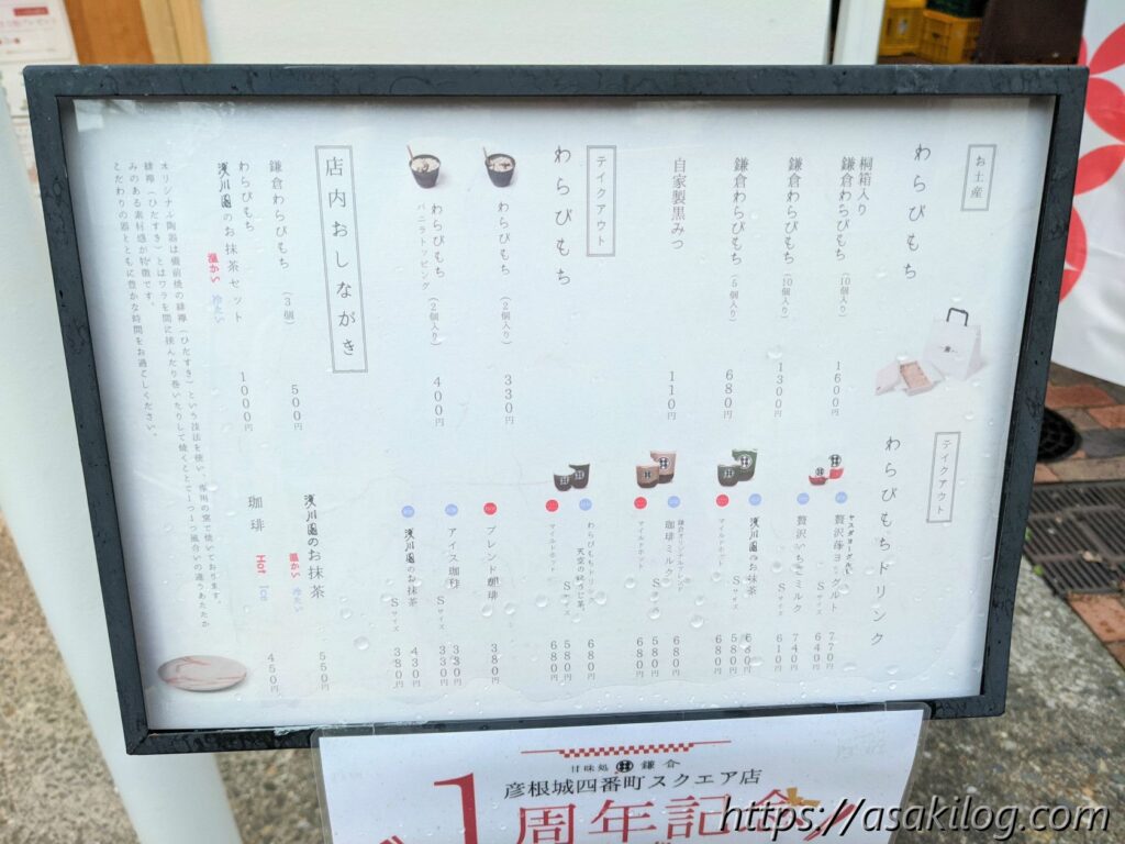 彦根城でたくさん歩いて1万歩超え!とかなり疲れ果てていたので、なにか甘いおやつを食べたくて。「甘味処鎌倉 彦根城四番町スクエア店」の店頭にある看板に惹かれて、ちょっと休憩することにしました。