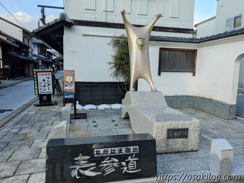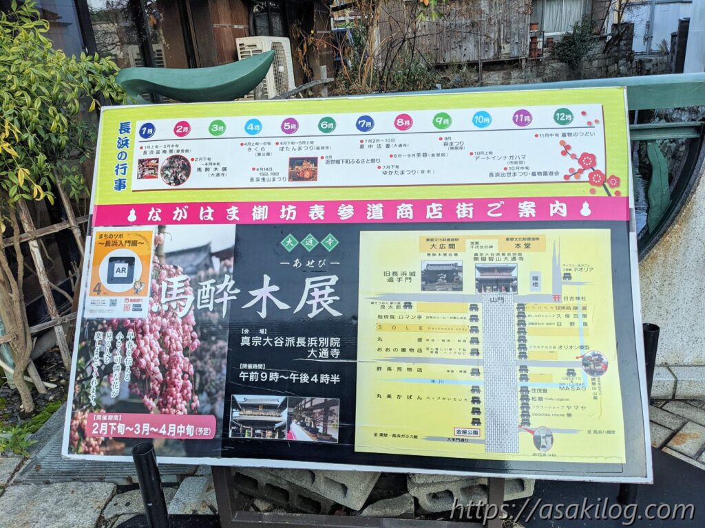 せっかくなので黒壁スクエアから少し離れたところも散策することに。左の写真マップは「ながはま御坊表参道商店街」のもの。右の写真「お花きつね」がある場所が入口のようです。このお花きつね、キンキラキンでものすごい存在感、もちろん娘の記念写真も撮影済(笑)。
