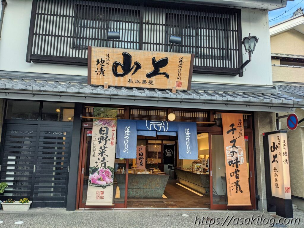黒壁スクエア周辺を散策し、駐車場へ戻る途中にあったのが、こちらのお店「近江つけもの山上(やまじょう)長浜黒壁」です。我が家は家族3人ともお漬物大好き!いろいろと試食したのち、右の写真の2つ(昆布大根、白菜刻み)を購入しました。数日後あまりに美味しくてあっという間に食べ終わり、もっとたくさん買ってこれば良かった~!