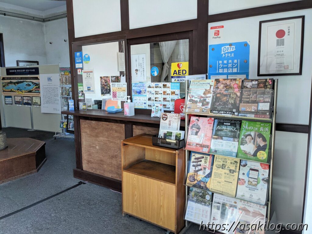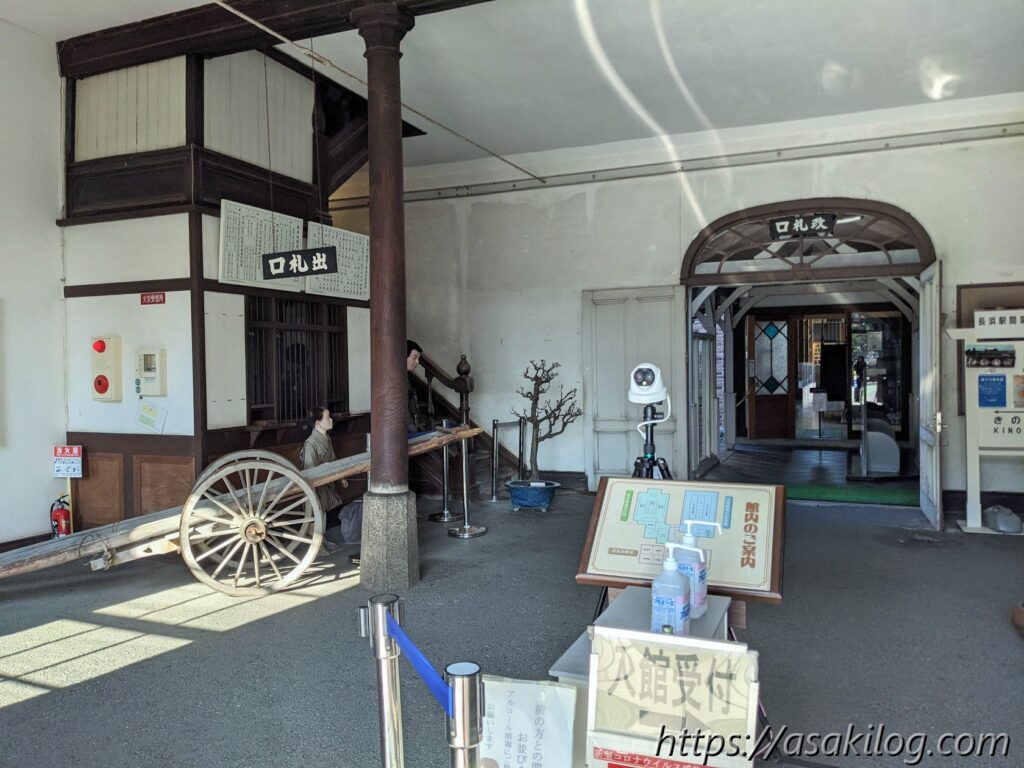 左の写真、長浜鉄道スクエアの建物に入ってすぐ・現在受付のあるこの空間は、当時は三等待合室だったそう。奥には改札口の案内も残されています。