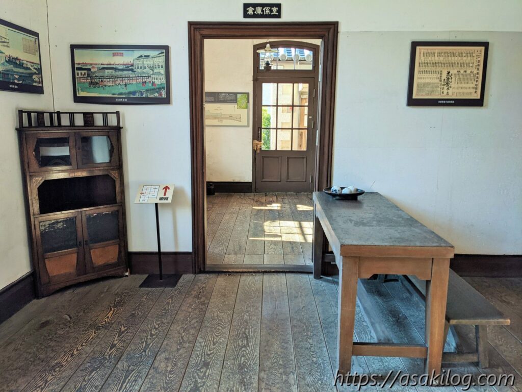 東西24.5m/南北9.7m、木骨構造の明治初期としては画期的な石灰コンクリート造り2階建ての建物で、イギリス人の技師・ホルサム氏が設計を担当・ホルサムの監督のもと神戸の稲葉弥助氏が工事を請け負ったという記録があるそうです。
